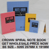 We are Supplier for CROWN SPIRAL NOTE BOOK A5 S204 207MM X 152MM sizes , appointed by Crown Note Book Malaysia to offer all note book with special best price , call 010 7778881