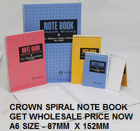 We are Supplier for CROWN SPIRAL NOTE BOOK S202 87MM X 152MM A6 sizes , appointed by Crown Note Book Malaysia to offer all note book with special best price , call 010 7778881