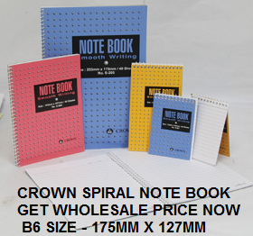 We are Supplier for CROWN SPIRAL NOTE BOOK S203 175MM X 127MM B6 sizes , appointed by Crown Note Book Malaysia to offer all note book with special best price , call 010 7778881